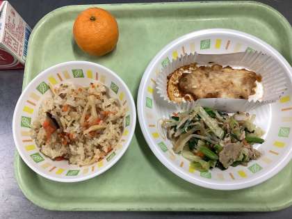 今日の給食は、中華おこわ、真鯛の香味蒸し、焼肉サラダ、ぽんかん、牛乳です。