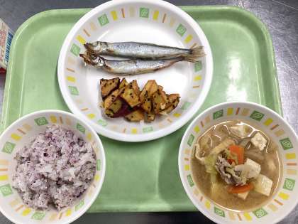 今日の給食は、ゆかりごはん、焼きししゃも、大学いも、豚汁、牛乳です。