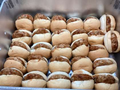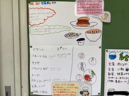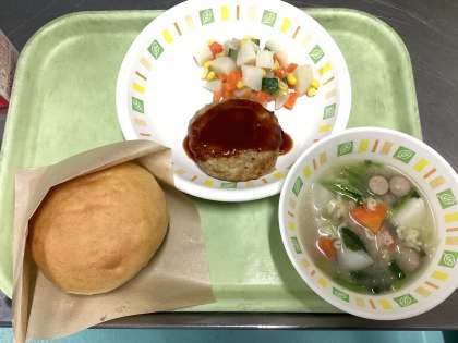 今日の給食は、ハンバーガー、じゃがいもときゅうりとにんじんのサラダ、ABCスープ、牛乳です。今日も6年生が考えた献立です。人気メニューが詰まっているので、どのクラスもよく食べていました。