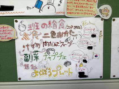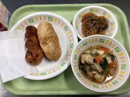 今日の給食は、2色あげパン、肉団子スープ、チャプチェ、牛乳です。今日も6年生が考えてくれた献立です。「よくぼうプレート」は、人気のメニューが詰まった献立で、たくさんのクラスが完食してくれていました。