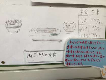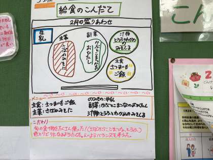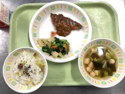 今日の給食は、さつまいもごはん、さばのみそ煮、かぶと小松菜のおひたし、豆腐とわかめのすまし汁、牛乳です。今日も6年生が考えてくれた献立です。