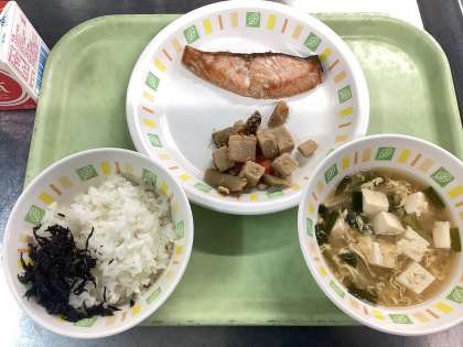 今日の給食は、有機米ごはん、ひじきのふりかけ、鮭の照り焼き、いりどり煮、にらたまみそ汁、牛乳です。