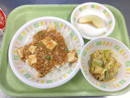 今日の給食は、麻婆豆腐丼、ツナのゴマドレサラダ、りんご(品種:ふじ)、牛乳です。