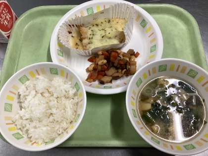 今日の給食は、七分つきごはん、鱈のポテマヨ焼き、五目豆、豆腐とわかめのみそ汁、牛乳です。