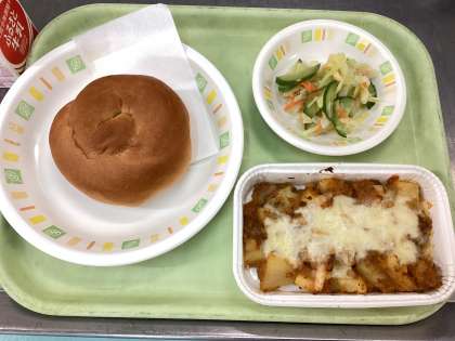 今日の給食は、黒砂糖パン、ポテトグラタン、コールスローサラダ、牛乳です。
