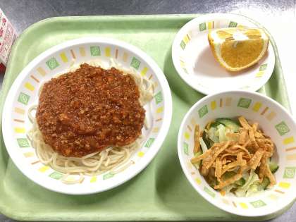 今日の給食は、スパゲティミートソース、パリパリサラダ、甘夏、牛乳です。安全・安心な美味しい給食を作っていきます。一年間よろしくお願いいたします。