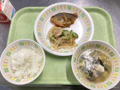 今日の給食は、ごはん、サバのゴマみそ焼き、五色和え、豆腐汁、牛乳です。