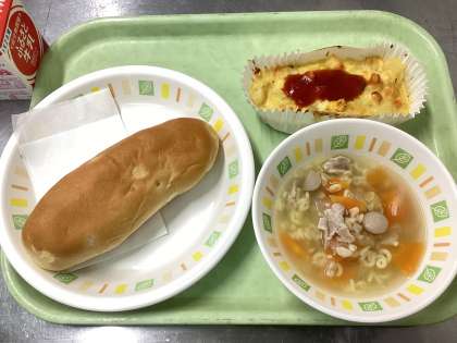 4月11日(木)の給食は、パインパン、スペイン風オムレツ、ABCスープ、牛乳です。