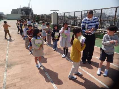 まずは、方位磁針を使って方角を確かめる方法を学び、その後、屋上で実際に方角を確かめました。