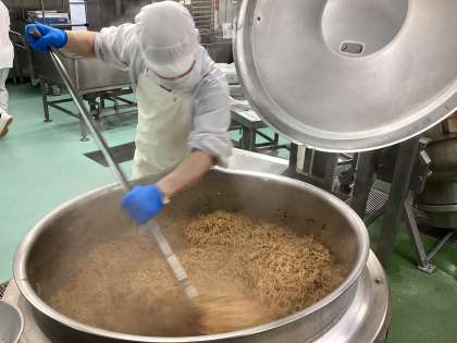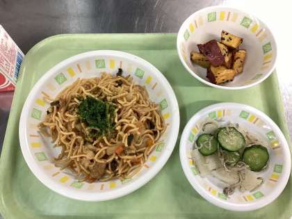 今日の給食は、ソース焼きそば、じゃこと野菜の中華和え、大学いも、牛乳です。