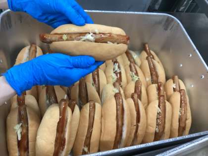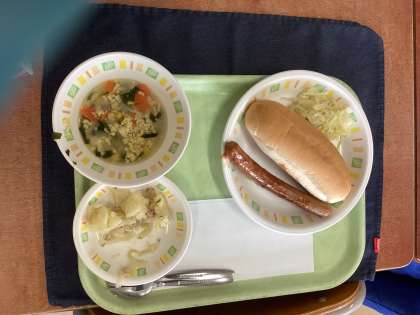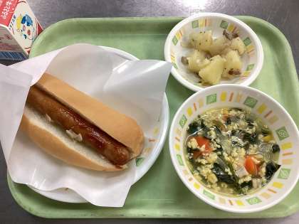 今日の給食は、ホットドック、卵とチーズのふわふわスープ、ジャーマンポテト、牛乳です。1、2年生は、給食室で具を挟み、3年生以上は自分で挟みます。