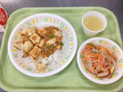 今日の給食は、麻婆豆腐、春雨サラダ、りんごゼリー、牛乳です。