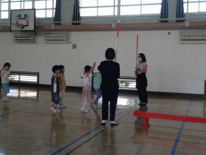 警察の方や保護者の方が見守ってくださる中、信号機や車に見立てた跳び箱などが置いてある体育館を、子供たちは危険を回避しながら上手に1周することができました。