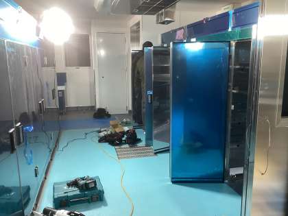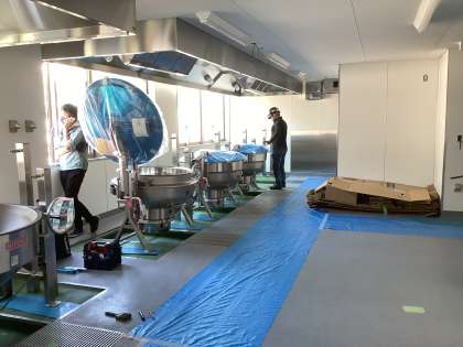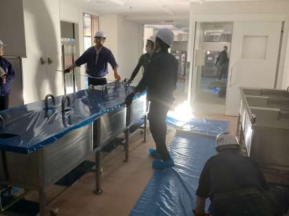 昨日、新校舎の給食室に、回転釜、シンク、カートごと入れられる食器消毒保管庫などが搬入されました。旧校舎と比較すると、とても広く、全てがピカピカでした。一学期の給食が終わり次第、旧校舎からも移設する機器もあり、整うにはまだまだ時間がかかりますが、給食を作るのが今からとても楽しみです。