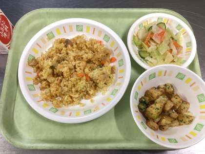 今日の給食は、ツナカレーピラフ、青のりポテトビーンズ、フレンチサラダ、牛乳です。