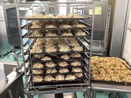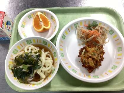今日の給食は、かけうどん、春のかき揚げ、野菜のごま和え、くだもの(清見オレンジ)、牛乳です。
