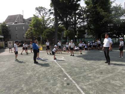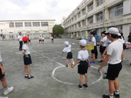 1年生は、6年生のお兄さん、お姉さんに計測してもらいながら