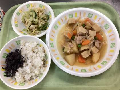 今日の給食は、麦ごはん、ひじきのふりかけ、肉じゃがうま煮、バンバンジー、牛乳です。