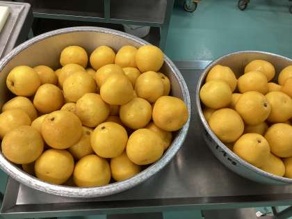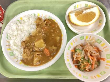 今日の給食は、米粉チキンカレーライス、こんにゃくサラダ、美生柑(愛媛県産みしょうかん)、牛乳です。美生柑は、和製グレープフルーツと言われ、柔らかく、爽やかな甘みのある、とてもジューシーな柑橘類です。