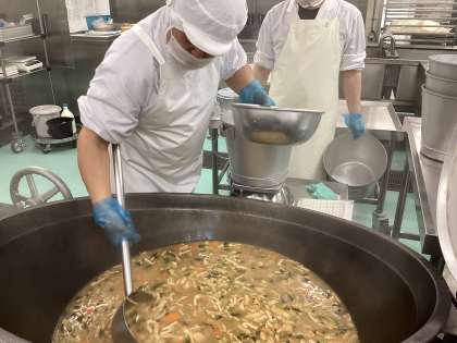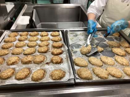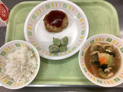 今日の給食は、ごはん、豆腐入りハンバーグ、ゆでそら豆、新玉ねぎと新じゃがいものみそ汁、牛乳です。