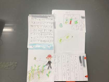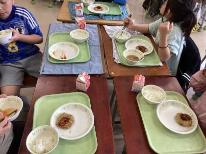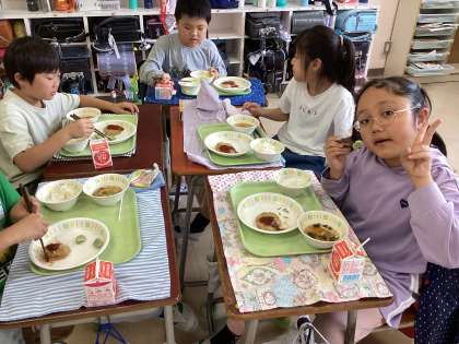 1、2時間目に、さやから取り出したそら豆を給食の時間にいただきました。自分でさやから取り出したそら豆の味は「あまーい」「おいしい!」「にがてー」など様々な感想が聞こえてきました。給食室に「そら豆の中はふわふわしていた」「さやむき体験楽しかった」「きらいですが、自分でむいたので食べてみたくなった」など、絵付きのお手紙が届きました。ご家庭で食べなれない食材ですが、給食を通して、旬や味を知る機会を作っていきたいと思います。