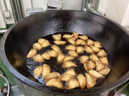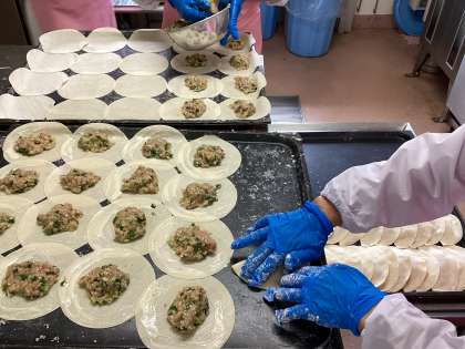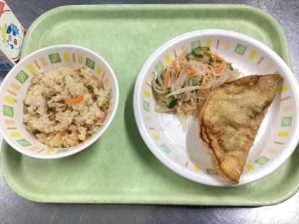 今日の給食は、中華おこわ、ジャンボ餃子、春雨サラダ、牛乳です。
