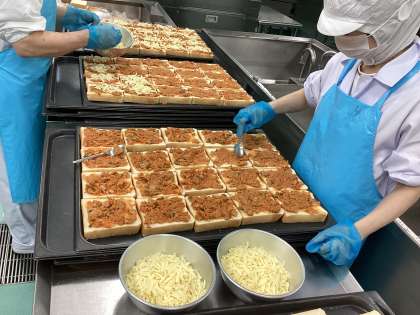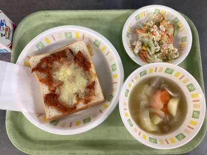 今日の給食は、ツナピザトースト、ポトフ、シーザースサラダ、牛乳です。