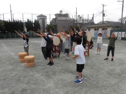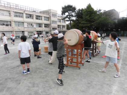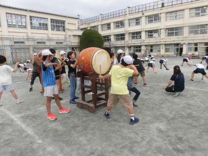 今日は、4年生の校庭での練習に6年生和太鼓も参加。