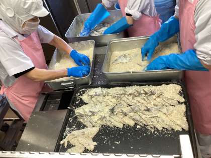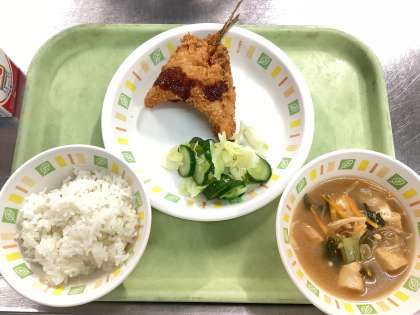 今日の給食は、七分つきごはん、アジフライ、野菜のひとしお、生揚げともやしのみそ汁、牛乳です。