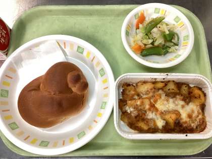 今日の給食は、黒砂糖パン、ポテトグラタン、フレンチサラダ、牛乳です。