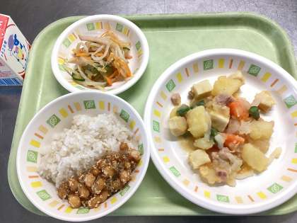 今日の給食は、麦ご飯、大豆とじゃこの甘辛揚げ、塩鶏じゃが、五色和え、牛乳です。