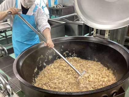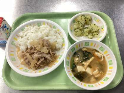 今日の給食は、七分つきごはん、豚肉の生姜焼き、粉ふきいも、豆腐とわかめのみそ汁、牛乳です。