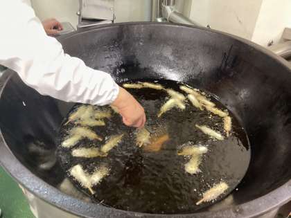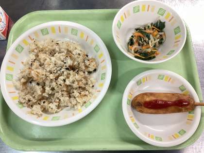 今日の給食は、しおかぜチャーハン、アメリカンドック、三色ナムル、牛乳です。
