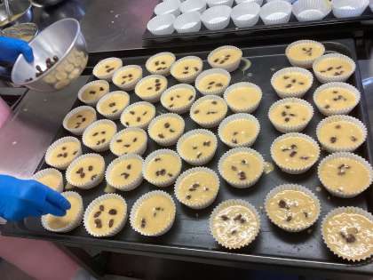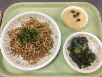 今日の給食は、海鮮オイスターソース焼きそば、ピリ辛きゅうりとわかめ、マーラーカオ、牛乳です。