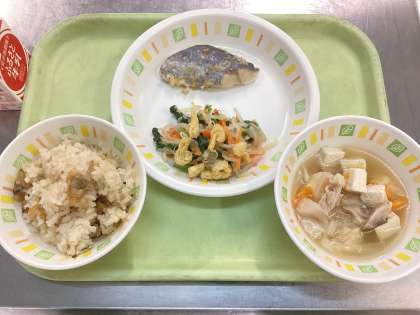 今日の給食は、深川めし、さわらのねぎ塩焼き、カリカリ油揚げと野菜の酢味噌和え、豆腐汁、牛乳です。