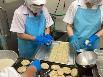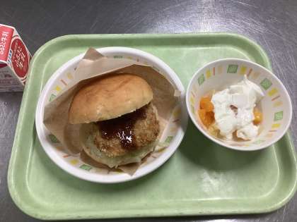 今日の給食は、コロッケバーガー、フルーツヨーグルト、牛乳です。