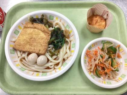 今日の給食は、冷やしきつねうどん、うずら卵のしょうゆ煮、野菜の梅おかか和え、パイナップルマフィン、牛乳です。