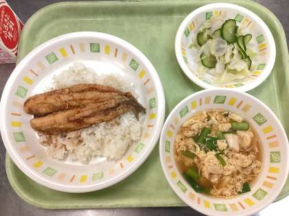 今日の給食は、いわしのかば焼き丼、夏野菜のひとしお、にらたまみそ汁、牛乳です。