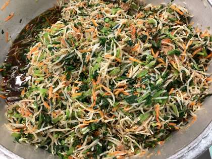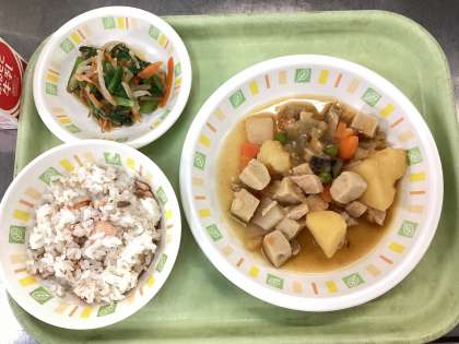 今日の給食は、鮭ごはん、いりどり煮、小松菜のおひたし、牛乳です。