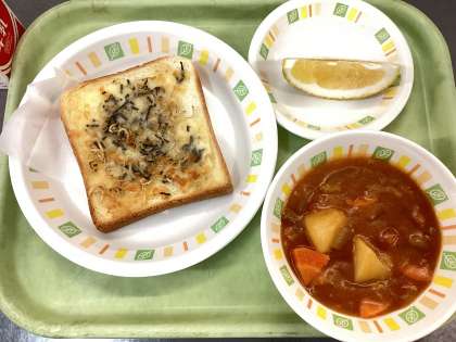 今日の給食は、じゃこトースト、トマトシチュー、河内晩柑、牛乳です。