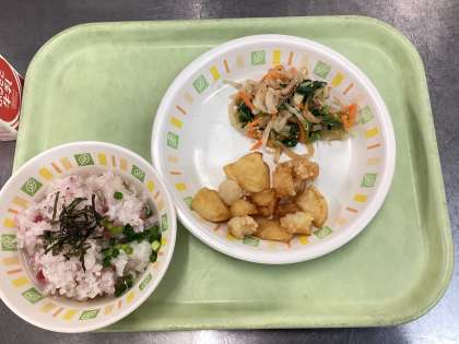 今日の給食は、梅茶漬け、いかとじゃが芋の揚げ煮、焼肉サラダ、牛乳です。