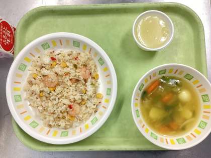 今日の給食は、ナシゴレン、カレーポトフ、りんごゼリー、牛乳です。