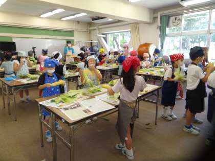 【7/4(木)2年生 トウモロコシの皮むき体験】