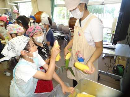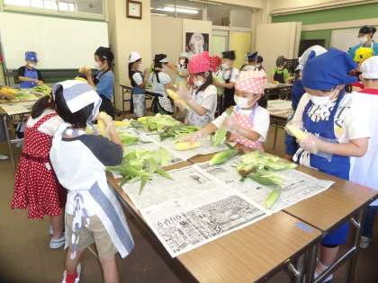 トウモロコシから大きな皮を取り、ひげを取りと、丁寧に作業を進めていった2年生。