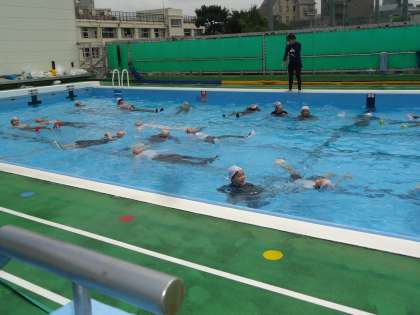 実際の水難事故に備え、洋服を着て泳いだり、ペットボトルを持って浮いたりする体験です。