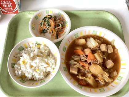 今日の給食は、とうもろこしごはん、タッカルビ、三色ナムル、牛乳です。