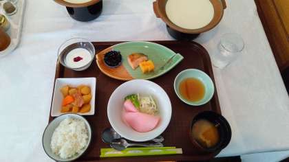 献立は、焼き鮭、肉じゃが、手作り豆腐などの