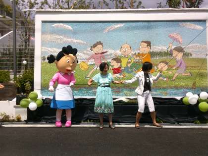 幕が開くと、サザエさん一家のすてきな壁画が現れました。