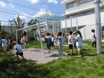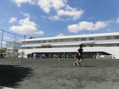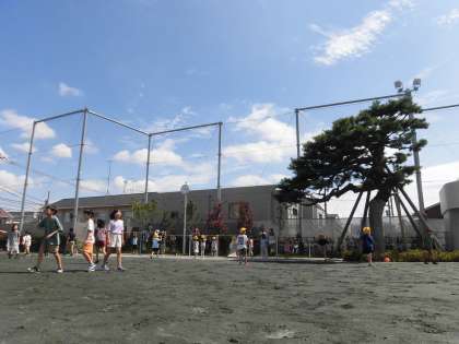 休み時j間に、新校舎の校庭を走り回る子どもたちは、