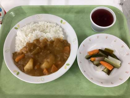 今日の給食は、カレーライス、ピクルス、ブドウゼリー、牛乳です。どのクラスもよく食べてくれていました。